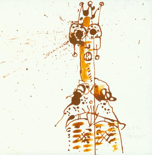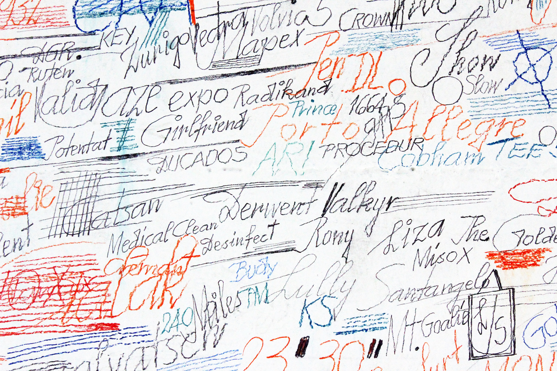 Der fast gänzliche Verzicht auf zeichnerische und sprachliche Konventionen bei allen drei Gestaltenden ist radikal und gleichzeitig frei von jeder Beliebigkeit. Die Arbeiten setzen weder einen narrativen noch einen gestalterischen Plan voraus und sie verfolgen auch kein Ziel. Sie entstehen vielmehr aus dem momentanen Einfall und ihre Berechtigung besteht im Vergehen der Zeit, die benötigt wird, sie herzustellen. Dies ist auch der Eindruck, den man gewinnt, wenn man Saxer beim fast manisch-seriellen «Bezeichnen» von Blatt um Blatt über die Schultern schaut (Video). Oder wenn man Dios in seinem Keller sieht, wie er selbstversunken Wand um Wand mit Schriftzeichen füllt. Auch bei Margrit Roth hat die Abfolge Slim-ähnlicher Gestalten einen meditativen Charakter.